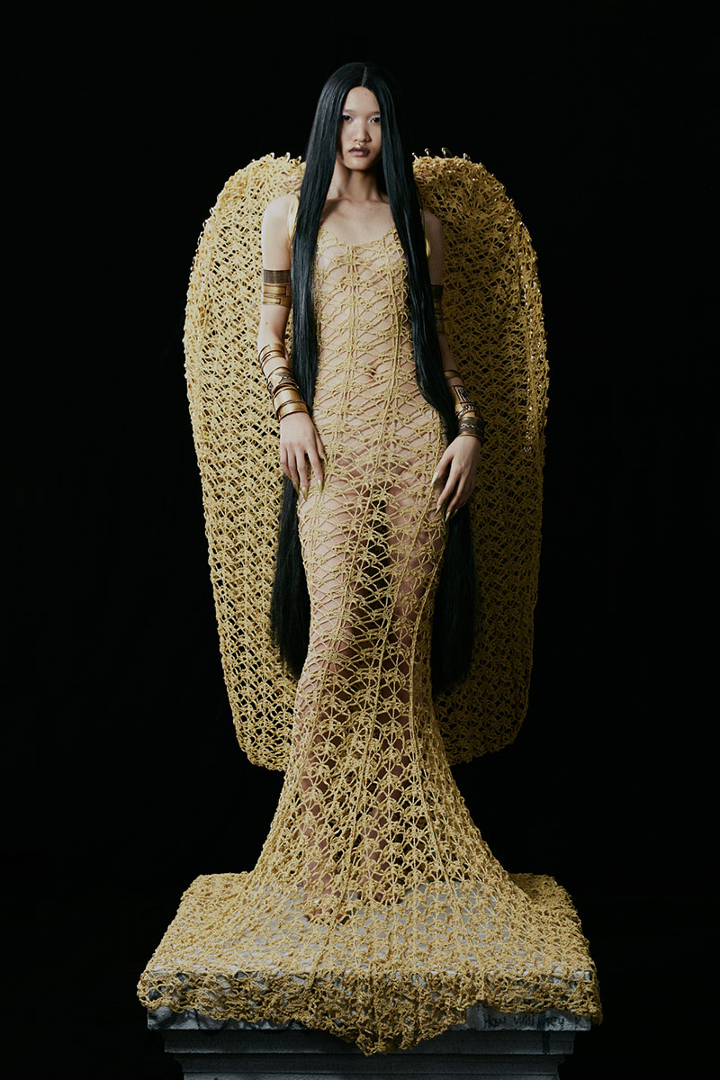 Por primera vez en la historia de la firma de moda china con sede en Londres, los diseñadores se han lanzado con el ganchillo para crear algunos de los looks más impresionantes de esta nueva colección: Podemos verlo en un look con grandes alas de Ángel, además de en otros items como las medias, camisetas y alguna chaqueta.