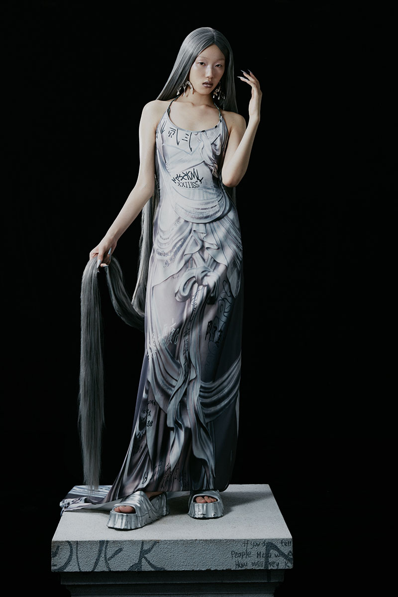 Desde que fundaron Marrknull, el objetivo de sus fundadores TimShi y Mark Wang ha sido buscar un equilibrio entre el pasado y el presente de la cultura china y los temas banales de la vida contemporánea. En esta ocasión, durante la ultima edición de la Semana de la Moda de Londres, han presentado la nueva colección Statue SS23, en la que materializan su propia versión del vinculo entre las representaciones divinas y los mortales.