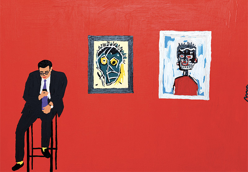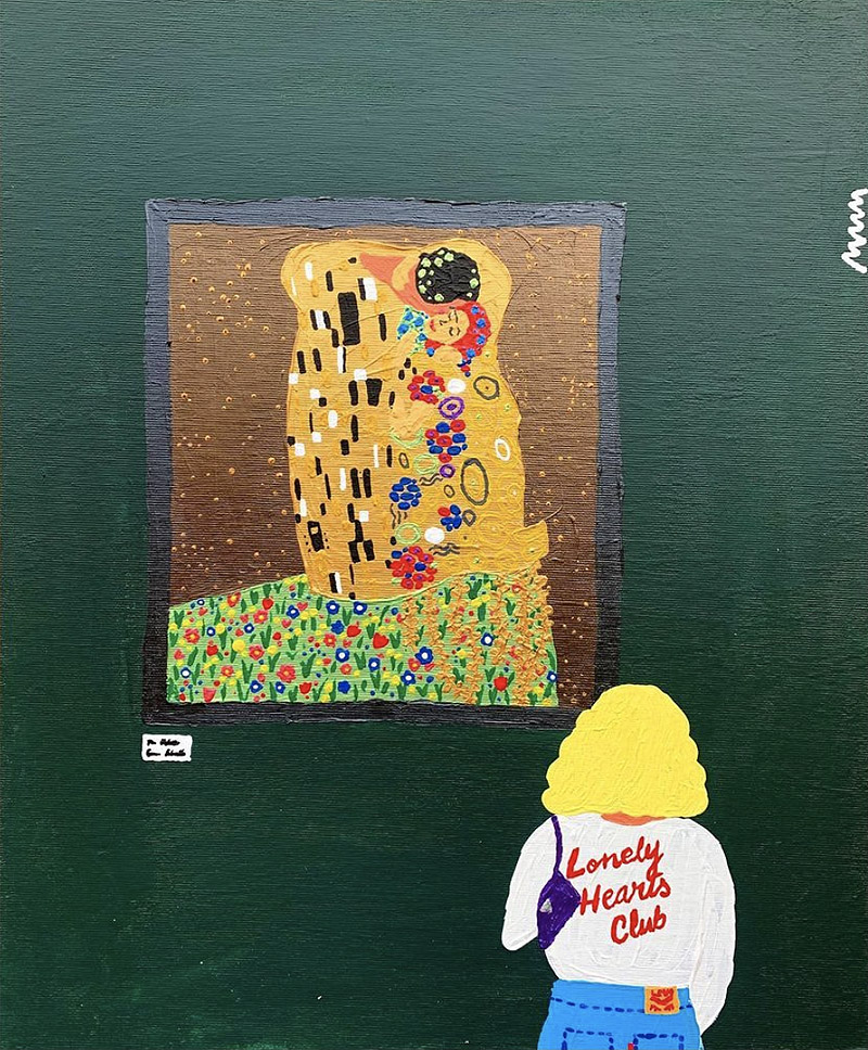 En el segundo confinamiento estancada otra vez en casa fue cuando surgió la idea para su segunda serie de cuadros, ‘Gente mirando a cuadros en museos’. Echaba de menos el plan de ir a museos y pasar algunas horas vagando por allí, no solo por el arte que muestran sino por la visita completa: la arquitectura del edificio, la cafeteria, la tienda o ver cómo son los cuartos de baño… Marta Morientes se dio cuenta de que lo que mas le fascina y entretiene son la gente que visita los museos y es ellos a quien hace homenaje en esta serie.