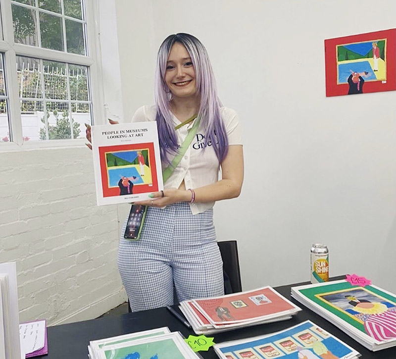 Con el éxito en Instagram de sus cuadros decidió crear un campaña de Kickstarter para publicar su primer libro cuyo nombre es el mismo de la serie ‘Gente mirando a cuadros en museos’. El libro contiene los catorce cuadros de la serie y dos ensayos que exploran desde un aspecto sociológico como la gente mira a cuadros hoy en día con un toque de humor. El proyecto culminó en una fiesta del lanzamiento del libro en Drop Studios al norte de Londres.