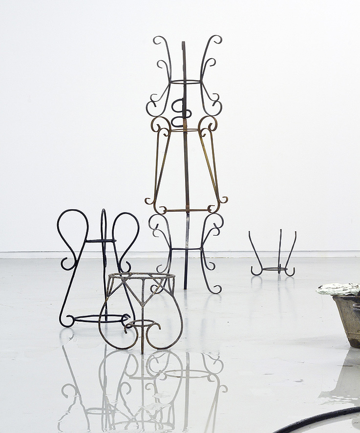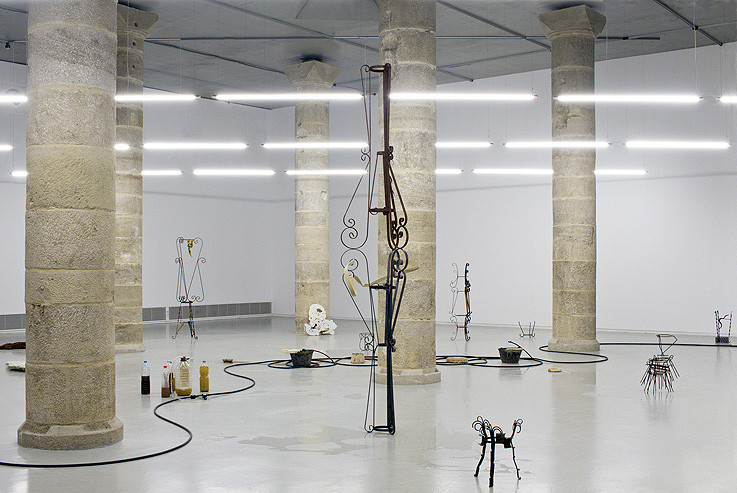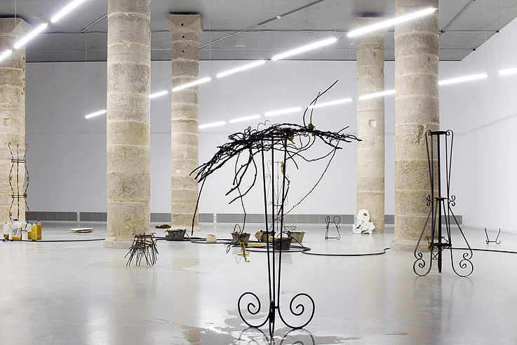 Miro la exposición y lo que veo sigue pareciéndome una cadena conectada de gestos deconstruidos, una naturaleza domesticada que sin embargo consigue desbordar de impurezas y sublimar la mera utilidad productiva. Hay un poco menos de “sustancias materiales circulando, fluctuando y descomponiéndose ante mis ojos”, como me dijo una vez Martín Llavaneras, pero la escultura sigue siendo performativa. Sigue habiendo algo que podríamos llamar, de alguna manera, un ambiente, un ecosistema, un contexto. Siguen habiendo recorridos y recovecos, repartición del espacio y materiales invitados, sensaciones de estar visitando ese margen divisorio entre lo humano y su entorno, de ver las marcas de lo humano en las materias, de devolver lo insólito y misterioso a lo que ya nos parece banal. Pero que quizás sea simplemente absurdo. Como dejar sin oxígeno a una naranja.