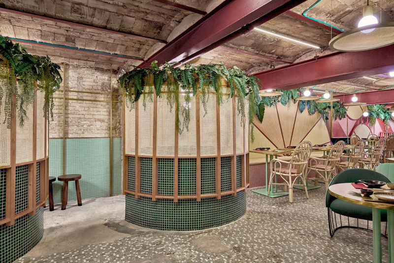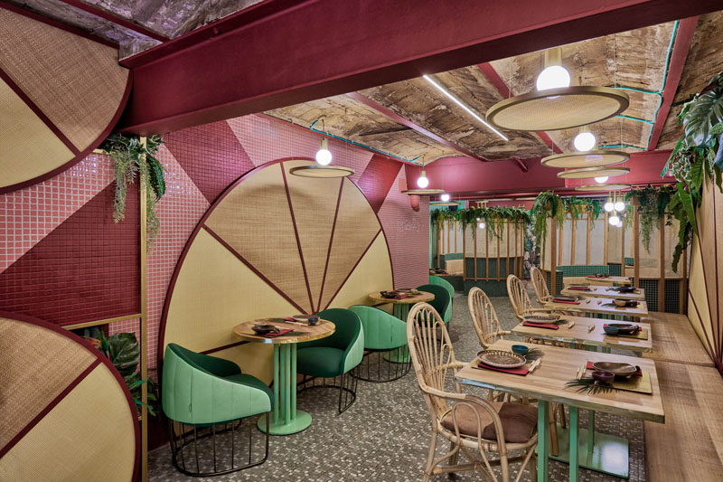 Nada más entrar al local se reconocen los círculos de rafia que representan los sombreros utilizados durante la recogida del arroz en el país asiático y que en este lugar se mezclan de una forma explosiva con el gresite colorido y las plantas tropicales. Una vez llegando a la barra podemos otra vez ver la mezcla entre Japón y Brasil con el patrón tradicional japonés en la barra y los patrones coloridos brasileños de los años 70.