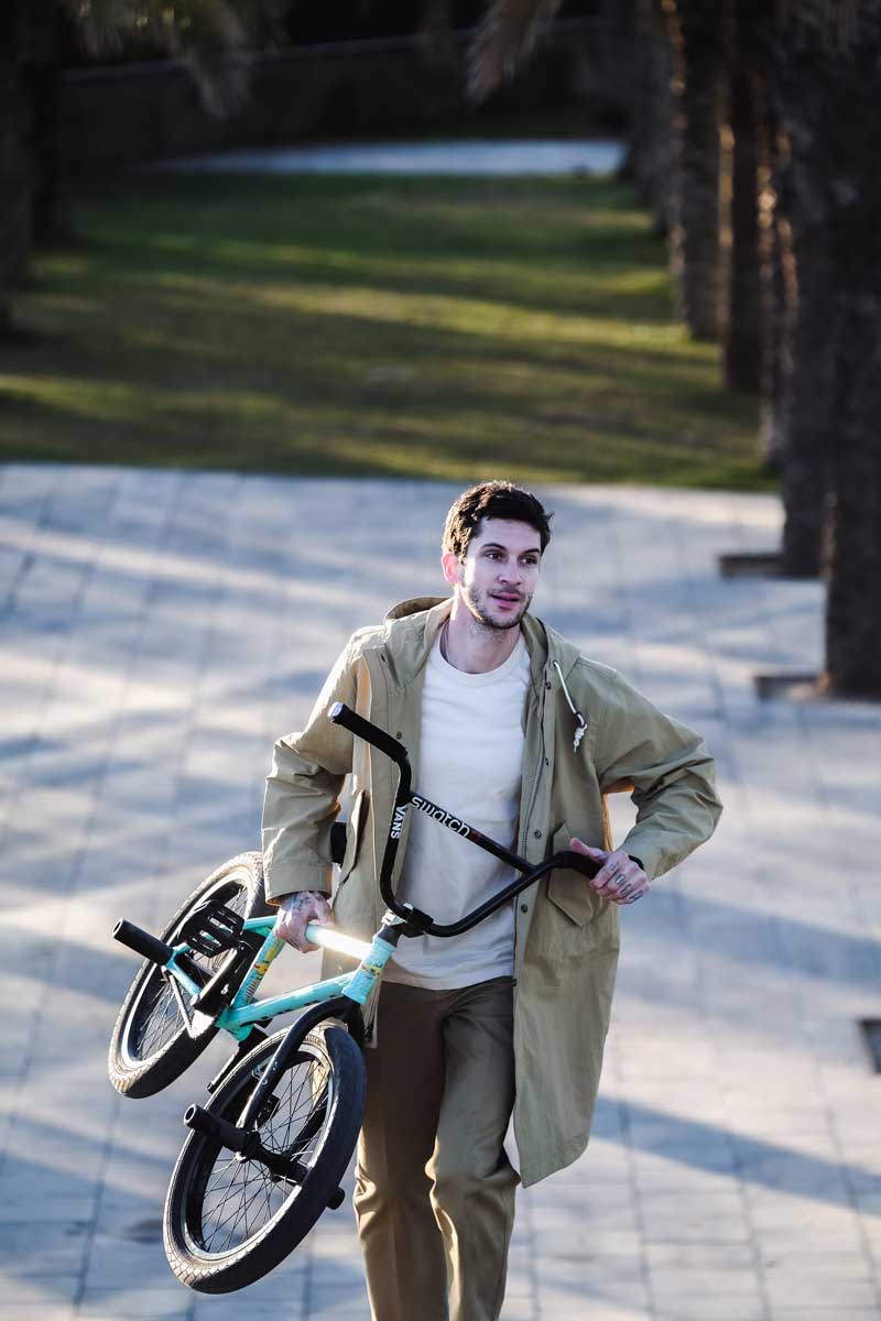 Matthias fluye de una cosa a otra sin establecer reglas. Lo mismo le ves dando vueltas en una cancha de street basket con su BMX, unos chinos y una camiseta de Dockers, que dando una vuelta con amigos por Brooklyn o en una fiesta de la Semana de la Moda de París, y todo con el mismo outfit. “Para mi disciplina deportiva necesito mucha libertad de movimiento, pero también es importante que la ropa me proteja. Y esa es la combinación perfecta que encuentro cuando me muevo con Dockers. Su ropa está hecha con tejidos de mucha calidad. Y es que no te imaginas la cantidad de tiempo que paso en el suelo mientras entreno. Todos los días me caigo, literalmente, mogollón de veces para perfeccionar nuevos trucos. Y por eso necesito outfits que sean resistentes, como los de Dockers. Y es que yo uso la misma ropa cuando estoy entrenando, que cuando estoy compitiendo. Es exactamente la misma ropa que uso todos los días. No me cambio de ropa para ir a tomar algo con colegas, ni tampoco para hacer piruetas. Dockers funciona tanto para montar como para el día a día más cotidiano. Yo, como muchos riders y skaters, somos fans del pantalón Chino de Dockers, son muy famosos en nuestro mundo. Y yo los llevo usando desde mucho antes de que nuestra relación se formalizase”, nos comenta el rider Mathias Dandois.