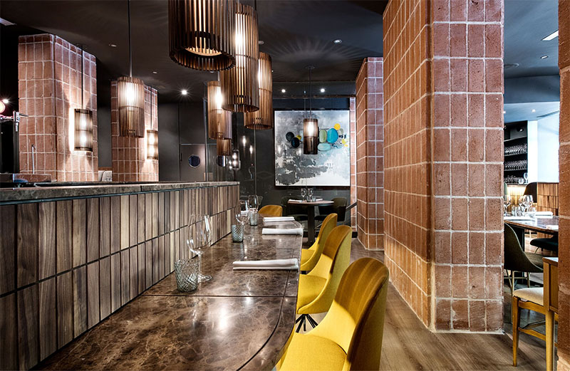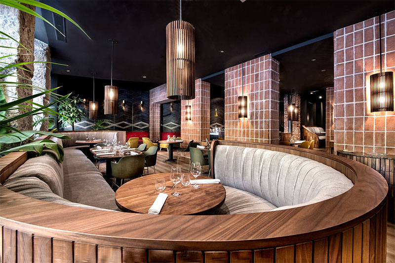 Estos elementos prefabricados dotarían de funcionalidad al conjunto y, de paso, definirían el concepto estético del restaurante. Entre ellos, dos barras de servicio, los gueridones, un sofá corrido de más de 7 metros de largo más otros dos de 4, mesas y lámparas. Cada una de estas partes expresan un lenguaje común de superficies curvas y mediante un “despiece enladrillado de taquitos de madera de nogal”.