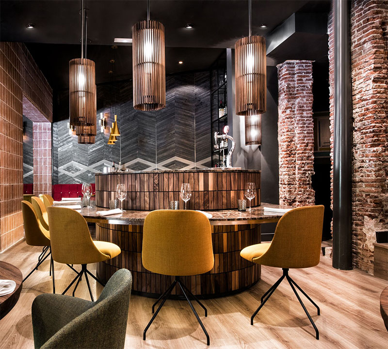 Las geometrías curvilíneas y el mencionado despiece enladrillado proporciona una sensación de dinamismo y, al mismo tiempo, de unidad. Esta actualización debía integrar los espacios que siempre han conformado el restaurante: tapería, gastronómico, biblioteca, salón privado, bodega y coctelería.