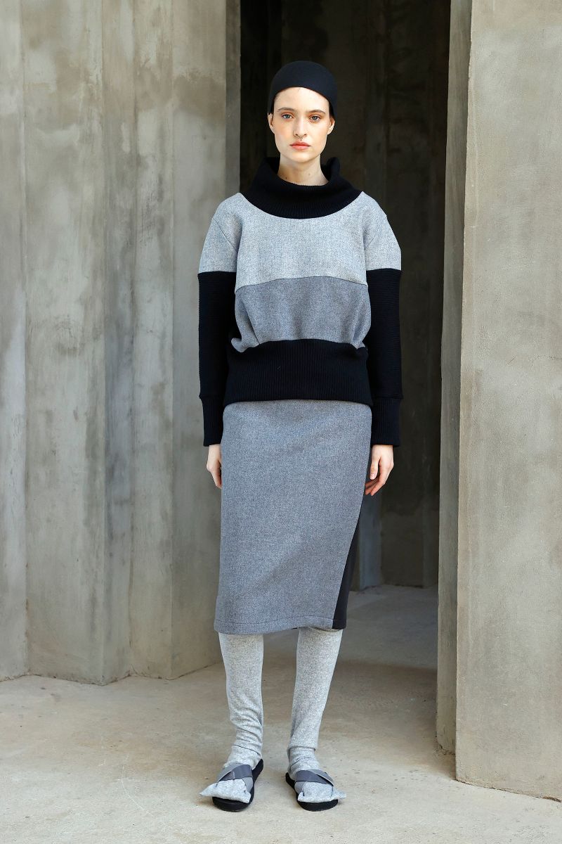 La diseñadora expresa cómo se siente actualmente, bajo la colección (A)sinfonía. Mediante composiciones espaciales y cromáticas, del gris, fucsia fuerte y negro, juega durante toda la presentación con capas superpuestas con el fin de explicar el vacío.