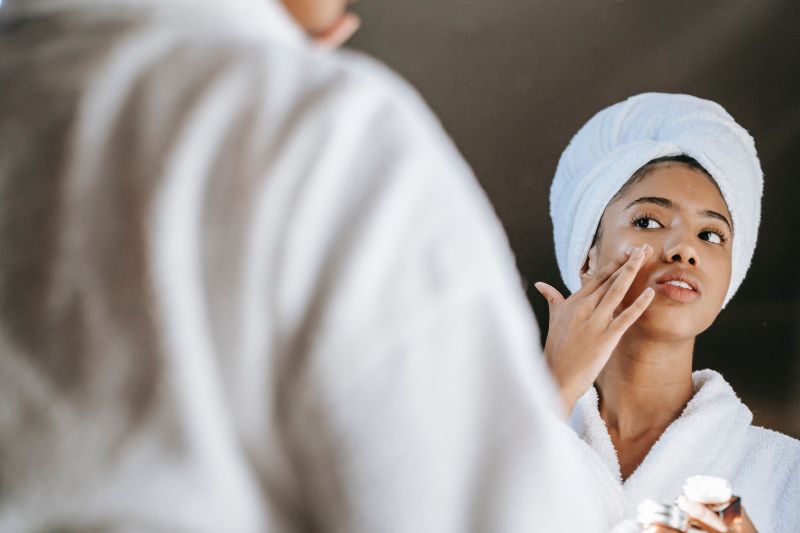 Arriba: Mujer utilizando crema facial en su rutina de belleza. Vía Pexels