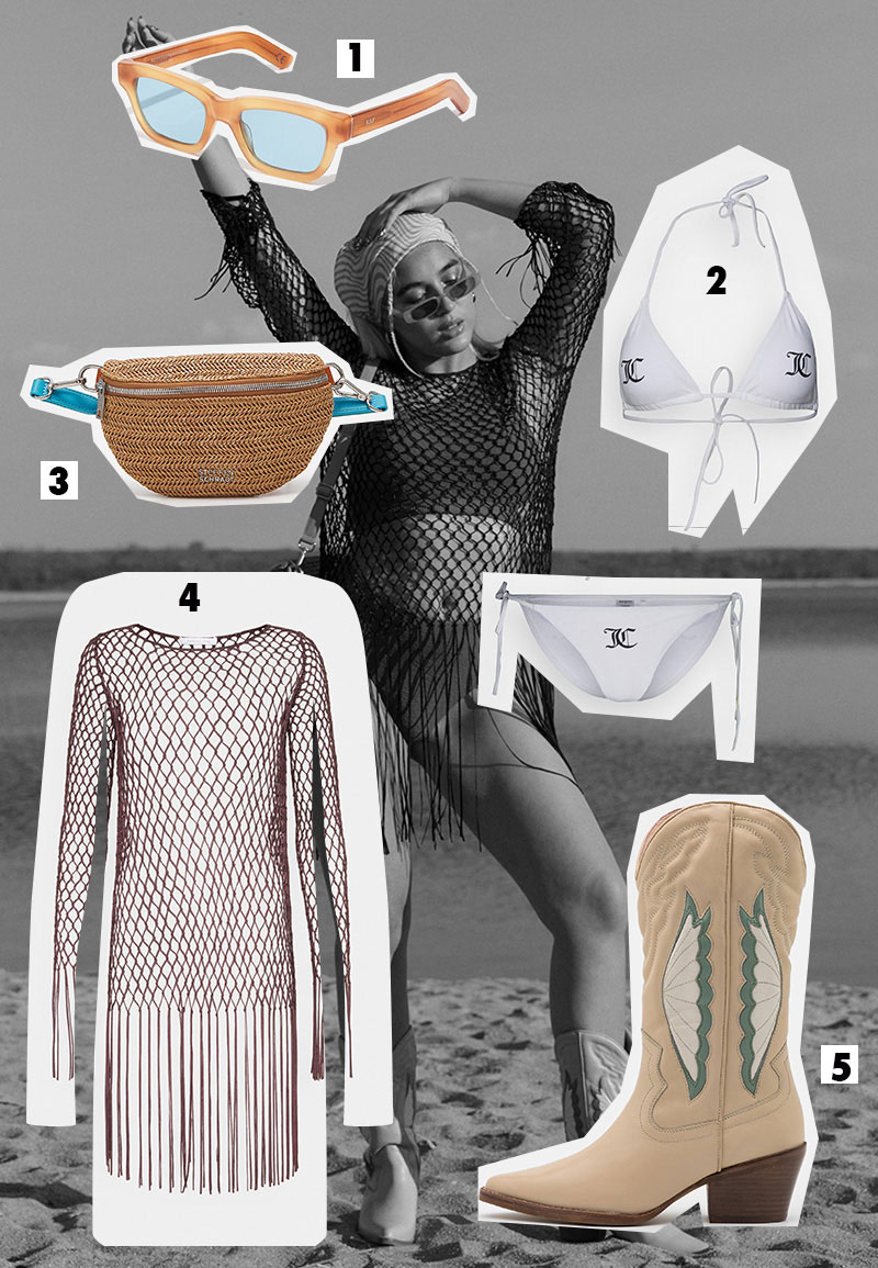 (1) Gafas de sol unisex de la marca Retrosuperfuture, modelo Milano. 169,95 euros / (2) Bikini Juicy Couture, Modelo Triangle Set, en Zalando 51,95 euros / (3) Riñonera trenzada de Steffen Schraut, modelo Sophie, 90,95 euros en Zalando / (4) Vestido Abito en redecilla de poliéster por Patrizia Pepe, 269,95 euros en Zalando / (5) Botas camperas de piel de la marca Bronx, modelo Jukeson Western. 109,95 euros en Zalando