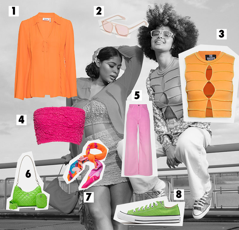 (1) Blusa naranja de Weekday, modelo Willow, por 34 euros en Zalando (2) Gafas de sol estilo aviador de Quay Australia, modelo On The Fly x Maluma Unisex, precio en Zalando, 43,95 euros (3) Top sin mangas naranja de la marca The Ragged Priest, modelo Leeloo, consíguelo en Zalando por solo 27,95 euros (4) Top con escote palabra de honor de la marca Cotton On, modelo Scrunchie Tube, lo puedes combinar con cualquier prenda como unos jeans o también como un conjunto con la falda a juego. Cuesta solo 18,79 euros en Zalando (5) Pantalones vaqueros boyfriend en rosa con campana estilo retro 70s, es de la marca Neon & Nylon, modelo Neonaga Hope Dip Dye Wide, en Zalando los encuentras por solo 42,65 euros (6) Set de cuero sintético en verde flúor de bolso de mano y bolsillo extraíble para smartphones. Es de la marca Steve Madden, modelo Bjamming Set, y en Zalando solo cuesta 79,95 euros (7) Pañuelo Fou Beach de la marca Desigual by Lacroix Maxi Carre, lo tienes en Zalando por 25,95 euros