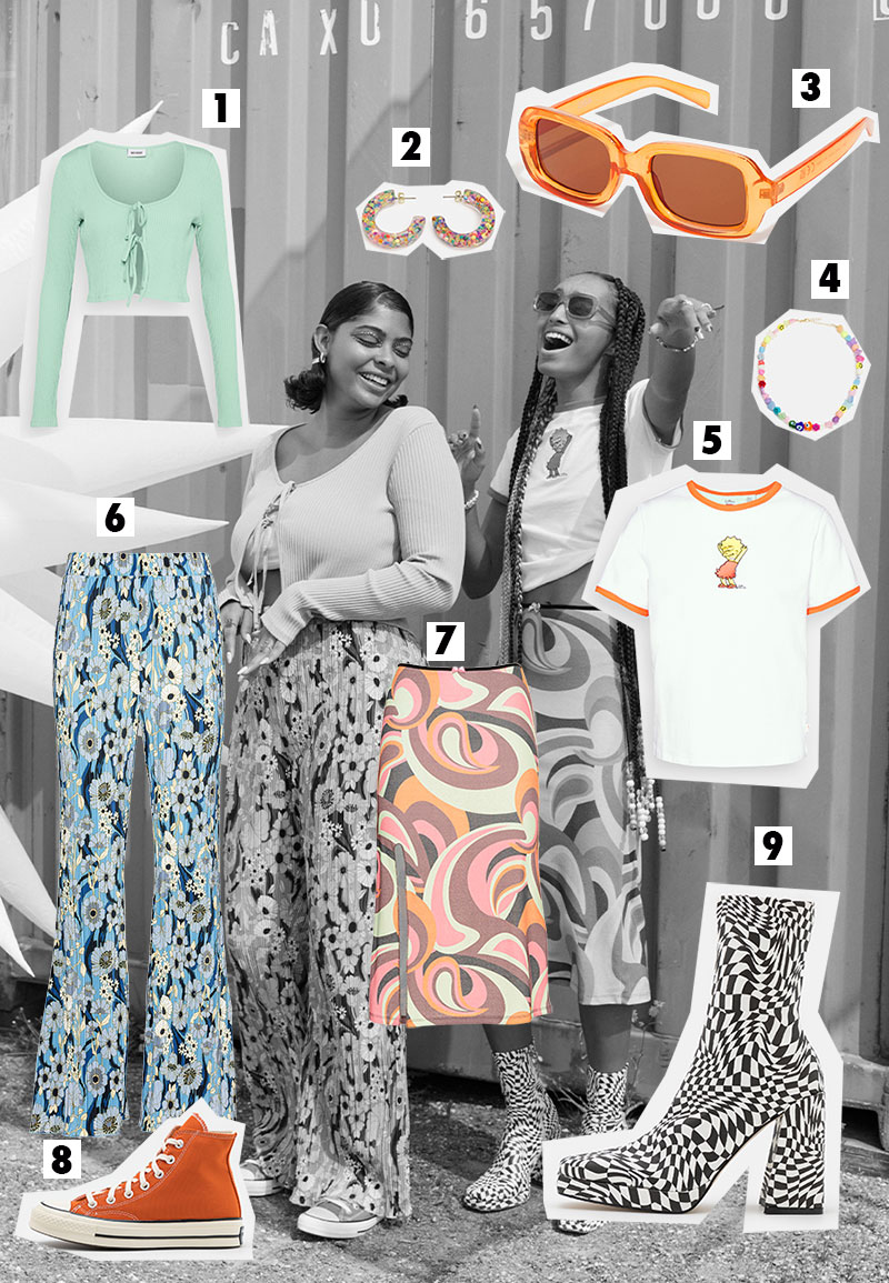 (1) Chaqueta de punto de la marca Weekday modelo Tie Cardigan, en Zalando solo cuesta 18,80 euros / (2) Pendientes multicolor de plástico de Fire & Glory, modelo Tani Earrings, el pack de 2 cuesta nada más que 14,95 euros en Zalando (3) Gafas de sol unisex de la marca Zign, solo por 14,99 euros y en Zalando las tienes en muchos juegos de color (4) Collar multicolor con smileys de Fire & Glory, modelo Tulla, solo 9,95 euros en Zalando (5) Camiseta estilo retro con Lisa de Levi’s x The Simpsons, en Zalando la tienes por 21,95 euros (6) Pantalón con estampado floral y cintura elástica de Monki, 22,90 euros en Zalando (7) Falda de tubo con estampado psicodélico estilo retro 70s de New Girl Order, solo 35,35 euros en Zalando (8) Zapatillas unisex retro de caña alta Converse Chuck 70 Recycled, en Zalando son tuyas por 71,95 euros (9) Botines de tacón tendencia retro 70s de la marca Raid, modelo Silonna, las tienes por 46,99 euros en Zalando