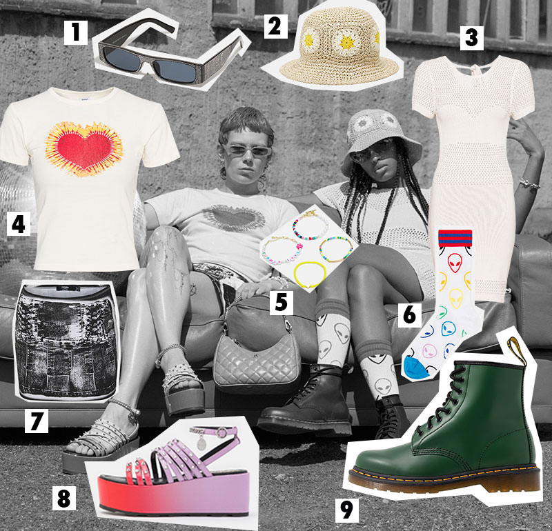 (1) Gafas de sol unisex de Vintage Supply, en Zalando las tienes por 18,95 euros / (2) Sombrero trenzado con estampado de flores de la marca Pieces, cuesta 24,99 euros en Zalando / (3) Vestido de punto crochet de Weekday, solo 32,90 euros en Zalando / (4) Camiseta estampada de BDG Urban Outfitters, modelo Heart Baby, consíguela en Zalando por 24,75 euros / (5) Pack de cuatro pulsera de Fire & Glory por 12 euros en Zalando (6) Calcetines unisex de Happy Socks, modelo Alien Sneaker, por 10,20 euros en Zalando (7) Minifalda de Jaded London con estampado de corset, en Zalando la encuentras por 23,39 euros (8) Sandalias con plataforma de Versace Jeans Couture, modelo Mallory Main por 104,95 euros en Zalando (9) Botas de Dr. Martens, modelo unisex 1460, y en Zalando las fichas por 189,95 euros