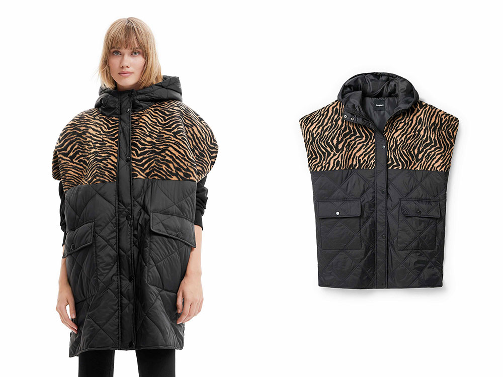 El poncho es una de las prendas antifrío más representativas de la moda por capas. De hecho, también se llama capa. Y en nuestra research nos ha llamado la atención este poncho acolchado con un estampado animal en la parte superior. Además, tiene capucha y cremalleras laterales por si lo quieres convertir en una chaqueta. El relleno de este puffer es 100% poliéster, y el exterior es una mezcla de materiales reciclados. Es de la marca española Desigual y cuesta 99,95 euros. Lo puedes comprar aquí.