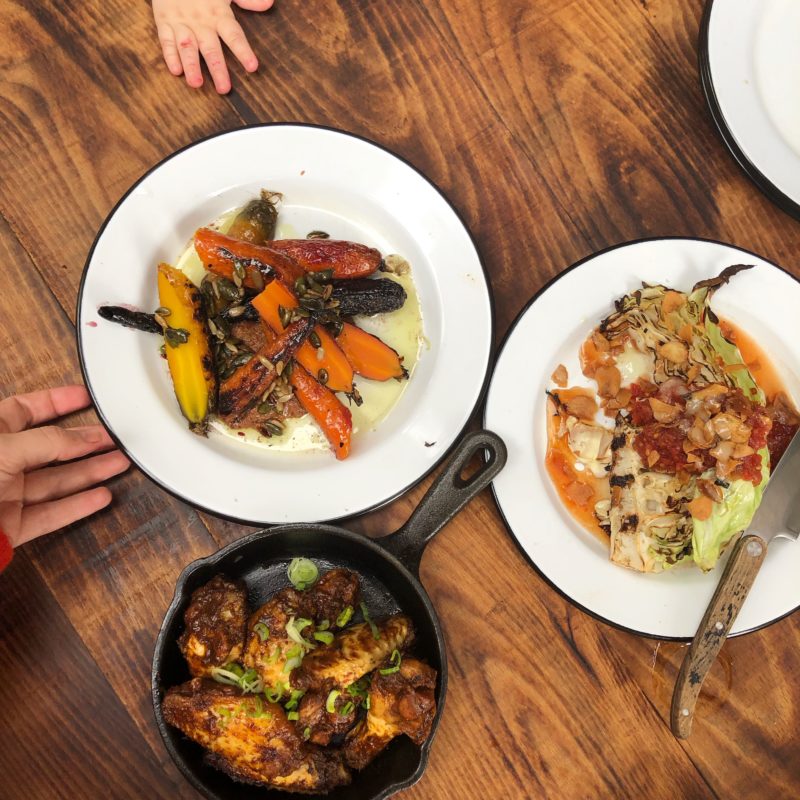 Comida Slow Food, carne de Cal Tomás como sello de calidad, fuego y humo. Carta concisa y directa y eso es todo amigos. Recomendable el costillar de cerdo, hecho con cuatro horas de ahumado y ocho de cocción, a un precio de 12, 95 euros. Mis preferidas son las zanahorias ahumadas y a la brasa sobre mole y las alitas de pollo, soy una adicta a éstas, y las de Fat Barbies ganan con nota.