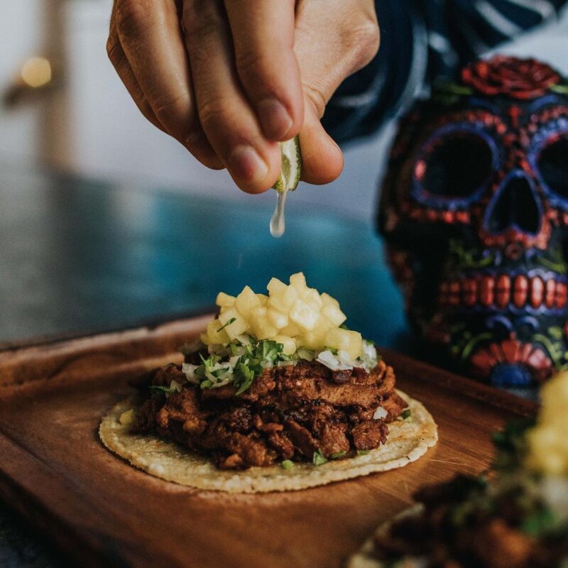 Imagen superior: el taco pastor sin gluten de Mawey Taco Bar