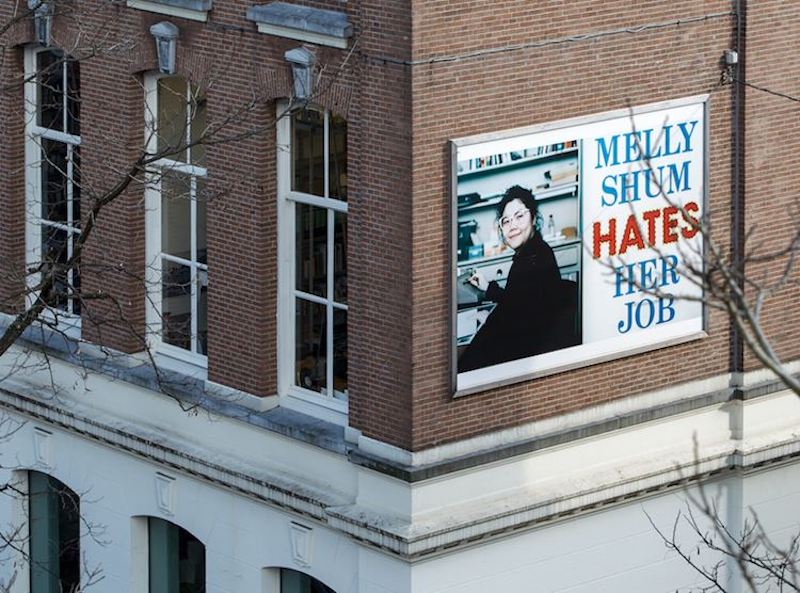Cartel “Melly Shum Hates Her Job” en las calles de Róterdam, cortesía de Ken Lum, 1990