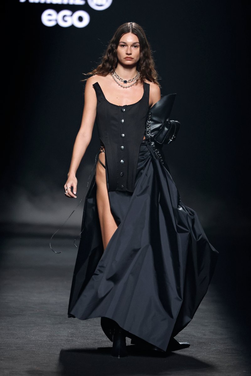 La tarde de la 23ª edición de Mercedes-Benz Fashion Talent continuó con Evade House. Sinceramente, ¿puede hacer algo más la diseñadora en esta edición? Participó en Madrid es Moda, en Allianz EGO y también en los desfiles del último día. Eso sí, Evade House no presentó una misma colección para las tres citas. Aquí partió de la base de los diseños de la 005 con el fin de llevarnos a un lugar incierto. La diseñadora fue más allá y elevó el proceso de investigación con prendas comestibles a partir de materiales provenientes de frutas y verduras.