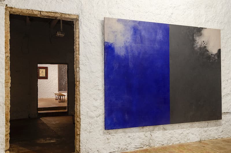 Vista de la exposición en L’Antiga Farinera ©ArnauEliasValentí. Izq: Joan Hernández Pijuan, “Camí” (1990). NoguerasBlanchard. Der: Joana Escoval, “It arises not from any cause but from the cooperation of many” (2022). NoguerasBlanchard