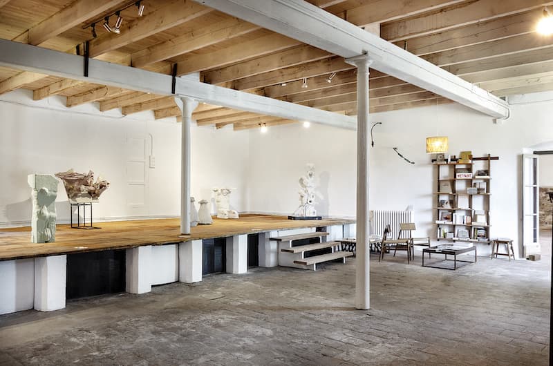 Vista de la exposición en L’Antiga Farinera, a la izquierda escultura de Juliana Cerqueira Leite, “Contraction 3” (2019). NoguerasBlanchard ©ArnauEliasValentí