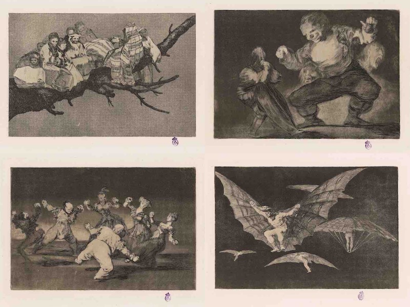 Francisco de Goya y Lucientes. De izquierda a Derecha y de arriba a abajo: Disparates: n.3: Disparate ridículo, n 4: Disparate de bobo, Disparate n.12: Disparate femenino, n.13: Modo de volar. Todos 1815-1819 / 1970. CortesÌa de la Real Academia de Bellas Artes de San Fernando. Calcografía Nacional. Madrid
