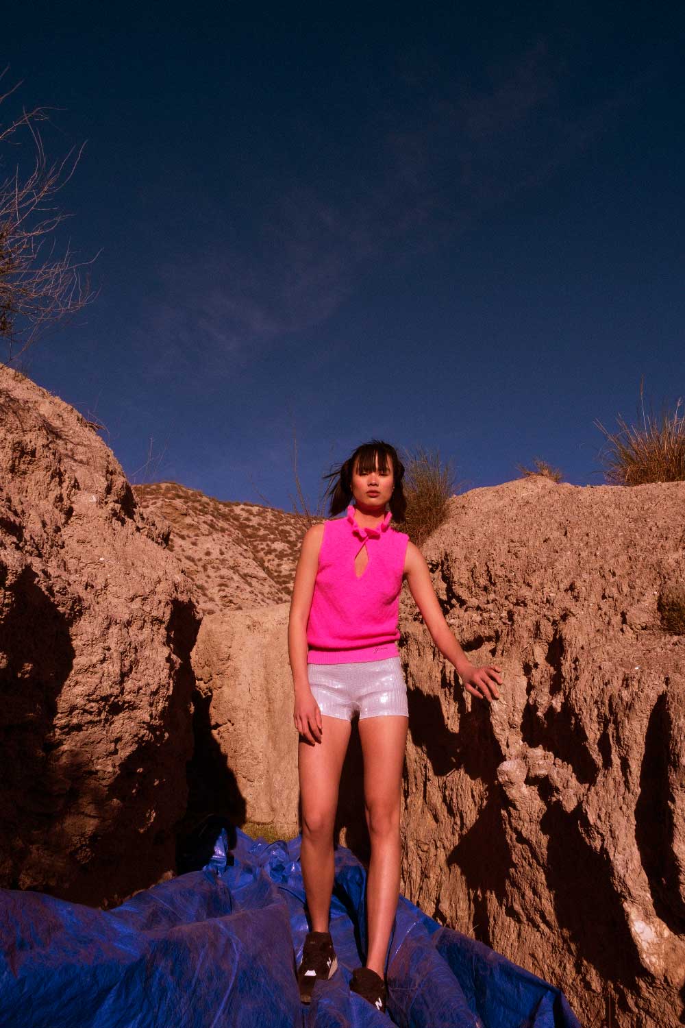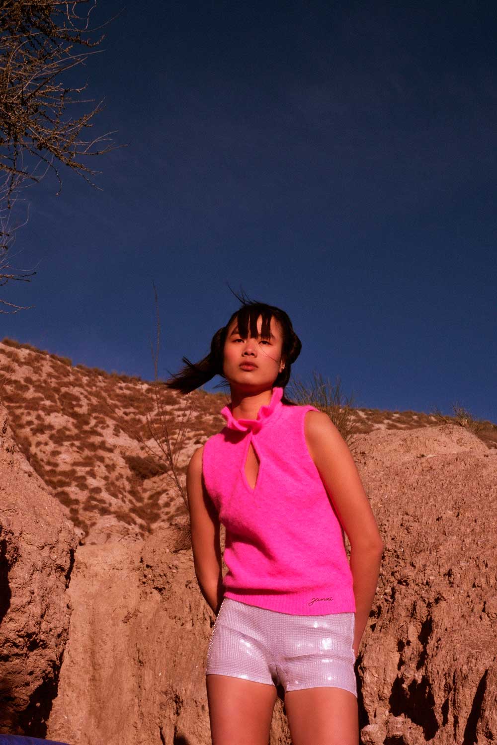 La modelo española Mei Ruiz con un top rosa de Ganni, shorts de lentejuelas de Dsquared2 y zapatillas New Balance