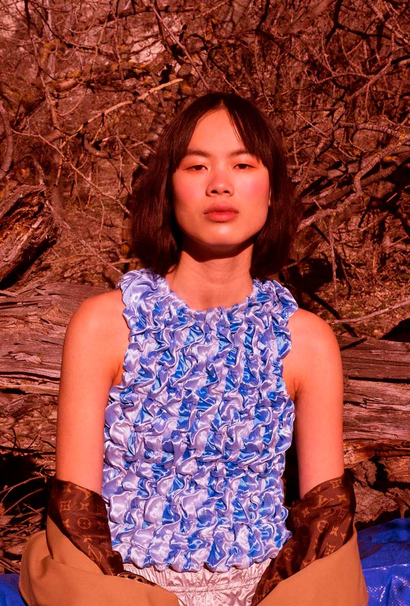 Mei Ruiz con top fruncido de color azul de Louis Vuitton, gabardina también de Louis Vuitton y pantalones cortos de inspiración sportswear de Alled Martinez