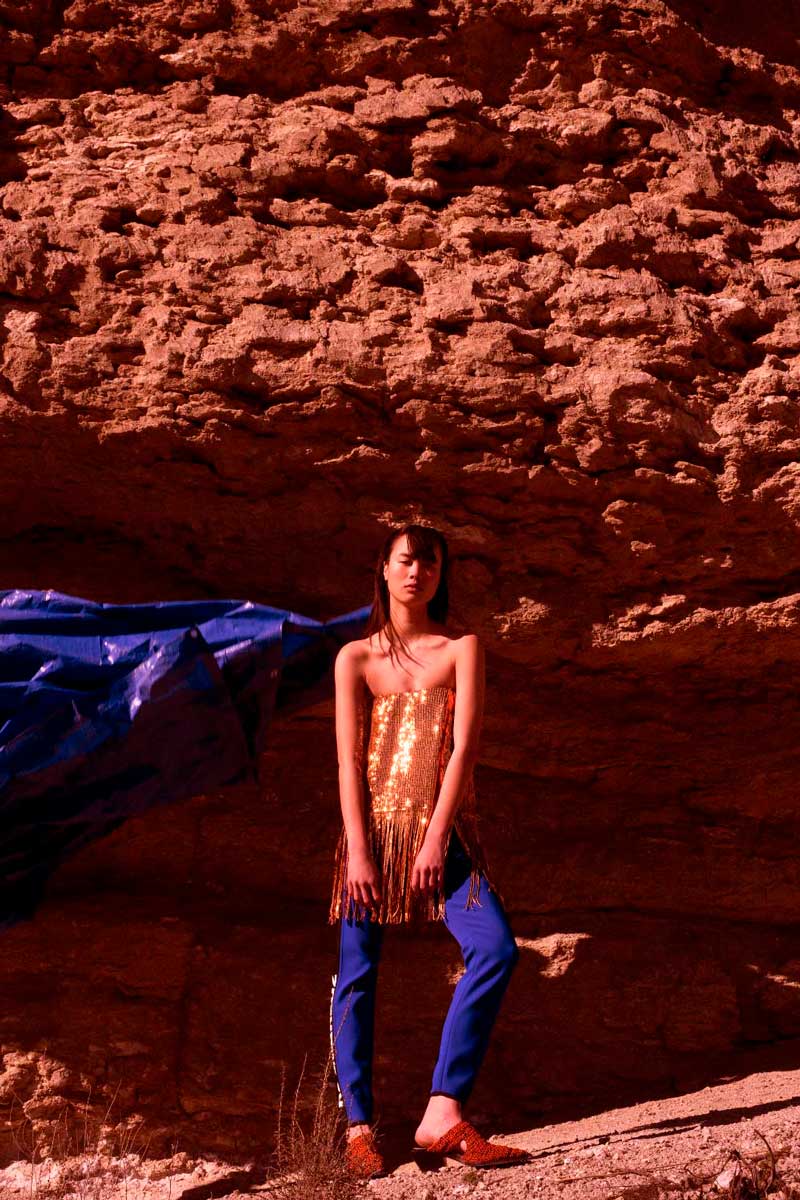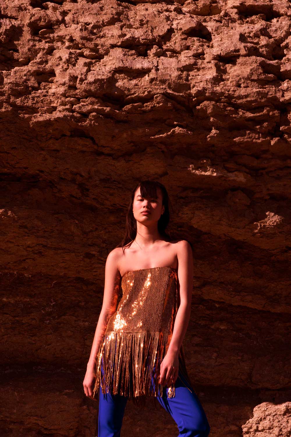 Mei Ruiz con un set de top y pantalón palazzo con lentejuelas de GDCS