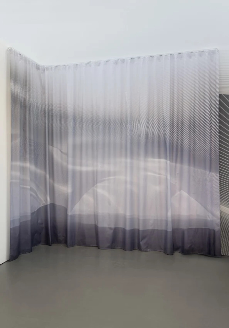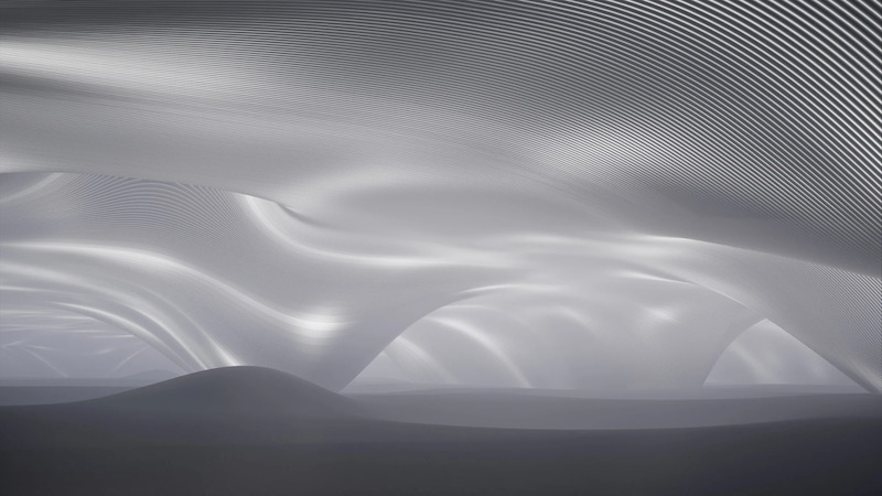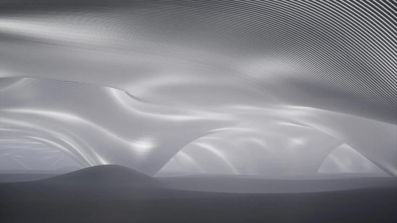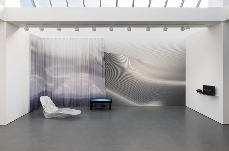 El epicentro de “Metaone” es SHAPE, formado por cortinas y tapices impresos estratégicamente ubicados para envolver a los visitantes. Elliot utiliza astutamente las cortinas como elementos multifuncionales, difuminando las líneas entre obras independientes, escenografía y separadores espaciales.