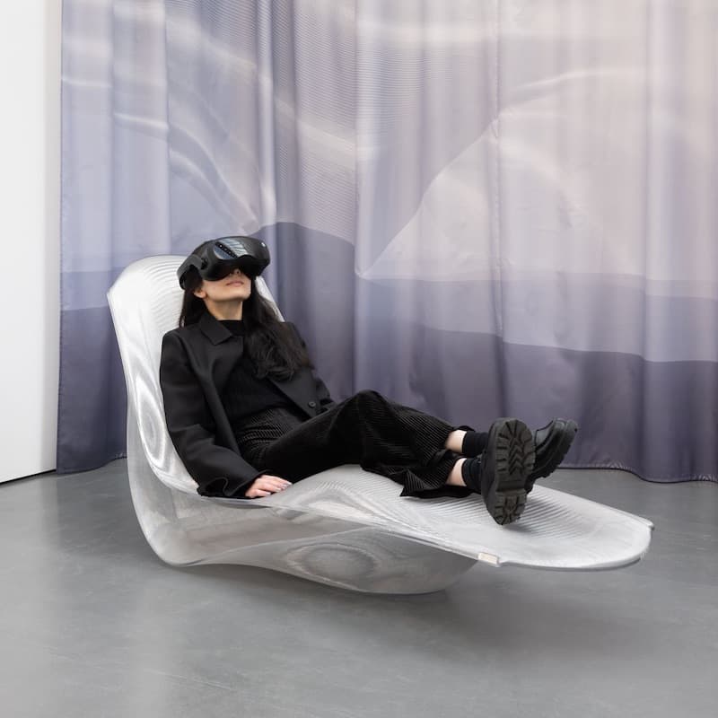Con maestría, Ben Elliot fusiona el casco de realidad virtual VIVE, videos, una silla, cortinas e imágenes impresas para crear un viaje inmersivo hacia el futuro.