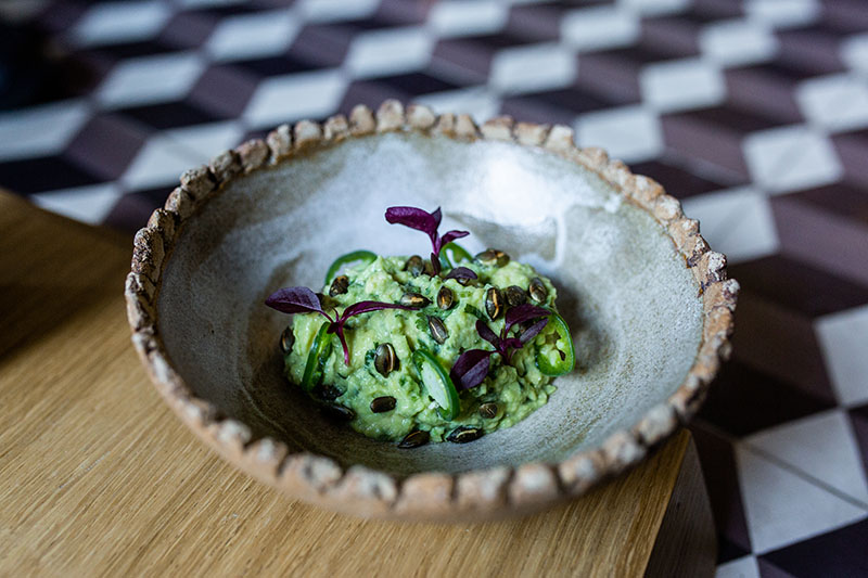 Mezcal Lab invita más que nunca a compartir e incluye elaboraciones tradicionalmente mexicanas, artesanales, con maíces patrios y ecológicos procedentes de su huerto. La propuesta se abre con el recuperado GUACAMOLE de Mezcal Lab, elevado ya a clásico y que se sirve con semillas de calabaza, chile jalapeño y totopos.
