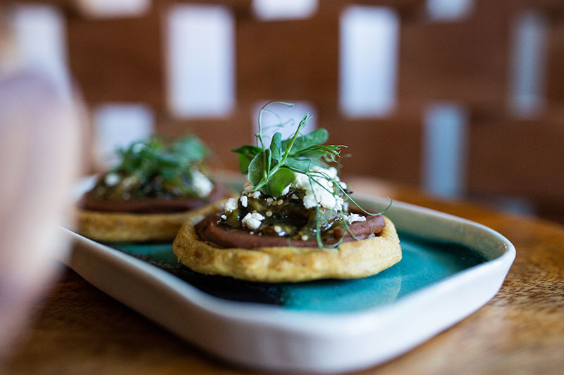 Los SOPES de frijol con tomatillo verde rostizado suponen el primer guiño vegetariano. Se trata de maíz blanco, con base de frijoles meneaos, tomatillos verdes asados al carbón y queso fresco. Les siguen las QUESADILLAS de huitlacoche y maíz morado, con salsa de tomatillo verde y queso Arzúa.
