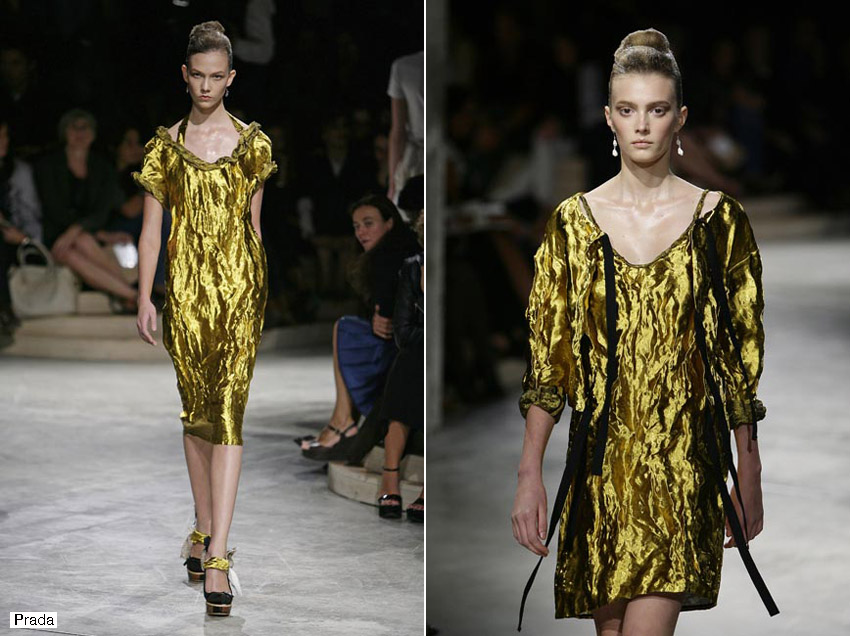 Prada en esta temporada será más bien recordada por los tambaleos o las caídas de las modelos, que intentaban llegar dignas al final de la pasarela sin romperse un tobillo. En esta edición es donde mas modelos he visto caer (también cayeron en Dsquared y Pucci). Para el verano 2009 Miuccia ha presentado una colección donde ha mostrado más carne que nunca, más de la que nos tiene acostumbrados. Los looks, según Miuccia, son primitivos con la intención de mostrarse simples, y nada recargados, ideas que son obsesiones en las mujeres. La mayoría de las salidas eran faldas lápiz, chaquetas cortas, cardigans, vestidos, sujetadores y tops que daban un aire de años 50 lleno de feminidad y sex appeal con tejidos arrugados en casi todas las ocasiones. En esta ocasión, después del encaje a lo Srta. Rottenmeyer dominatrix, Prada ha sabido leer la mentes de las mujeres y sus obsesiones, que después del gym, pilates, personal trainers, Dr. Chams y corte y confeccion, lo unico que quieren en ellas es una mujer sexy.