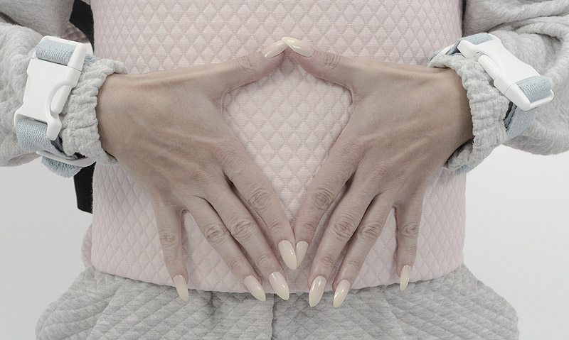 Por la cuidada estética de sus creaciones y la sinestesia de sus instalaciones, uno podría pensar que su trabajo se ciñe a un cierto formalismo sensorial, más cercano al diseño y la publicidad que al arte. Nada más lejos de la realidad. Su universo es una atrevida manera de sumergirse en las cuestiones metafísicas de siempre. Los nuevos altares resultan ser mesas de masaje o sillones ortopédicos. Los dioses por venir tienen caras biónicas, máscaras antiarrugas y chandals de diseño. Los querubines hacen ASMR y los profetas invocan posturas de yoga. Los ritos, espacios y referencias saturan las imágenes de Borrás en un intento de revisitar ceremonias trascendentes que conectan transhumanismo, progreso y biotecnología.