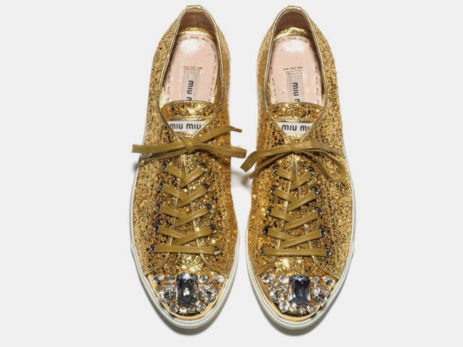 Con un exceso de ornamentación, las nuevas sneakers de Miu Miu son un poco barrocas, algo rococo, y hasta ligeramente góticas, puntillistas y mudéjares… Totalmente decadentes, fantásticas y maravillosas. Fabricadas en charol, lamé arabesco o terciopelo, y decoradas con glitter, punteras metálicas y pedrería de cristal. Disponibles en todos los colores del discreto encanto de la burguesía: oro, plata, negro y sonrosado. Por un otoño brillante y esplendoroso, a la venta en todas las boutique de la marca y online.