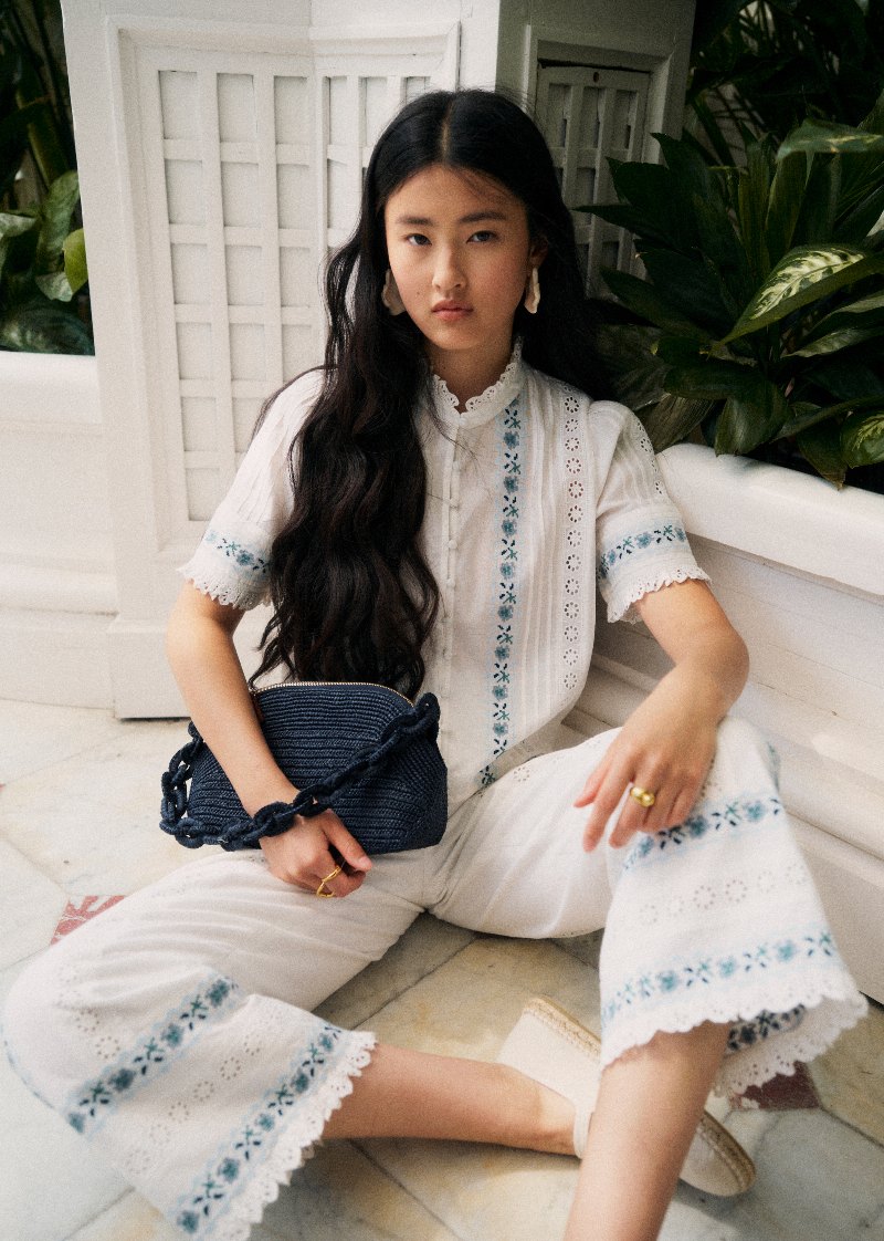 Empezamos con un pantalón que nace del amor compartido por el bordado y el detalle entre Sézane y Andión. Te encantará por su pierna ancha y su combinación de colores rosa y blanco, muy apetecible. Además, es de algodón y muy fresquito.