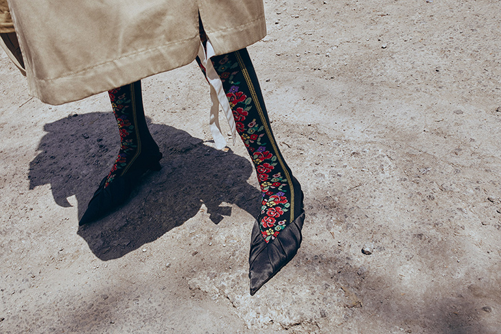 Arriba: Abrigo, falda y slippers H&M Studio + blusa Paloma Lira + bolso Chanel + gafas Tepito + medias Gucci