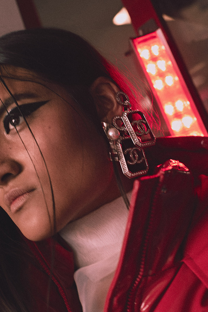 Arriba: Camisa Alejandra Quesada + chaqueta Adidas Originals + pendientes Chanel + pendiente Adolfo Dominguez