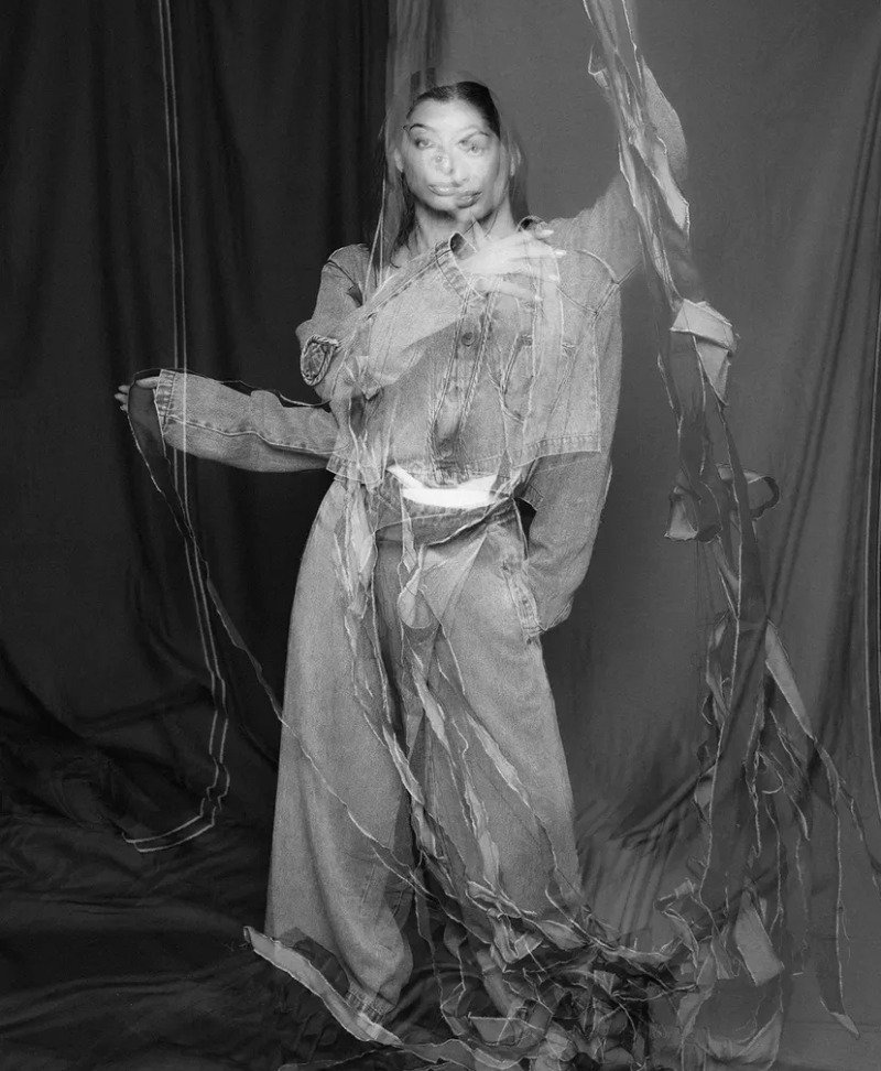 La segunda prenda es un vestido Zero Waste, destacado por su innovación en diseño y producción. Está confeccionado a partir de residuos textiles, optimizando al máximo cada fragmento de tela. Con esta pieza, Skfk reafirma su compromiso con una moda más responsable y respetuosa con el entorno. Por último, el pantalón completa la colección con un corte geométrico definido por las líneas limpias y estructuradas que caracterizan a la marca. Un diseño contemporáneo que combina funcionalidad, estilo y coherencia con los valores sostenibles de Skfk.