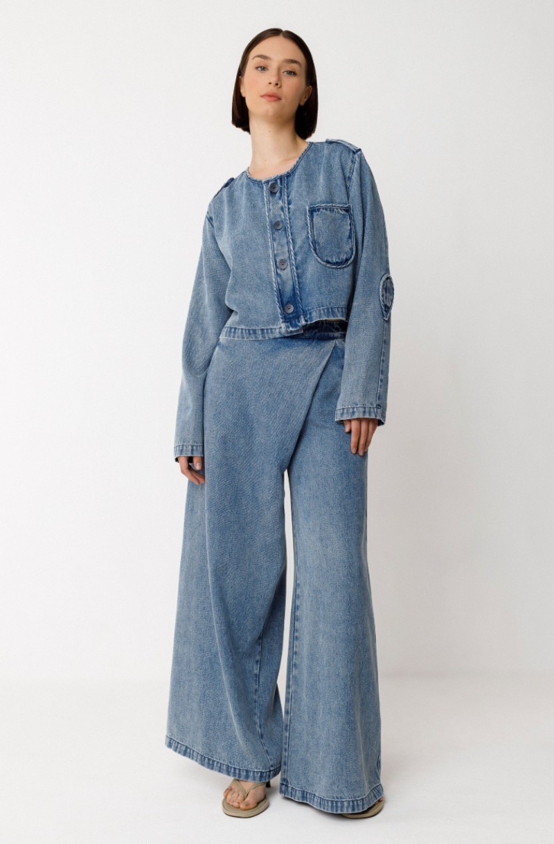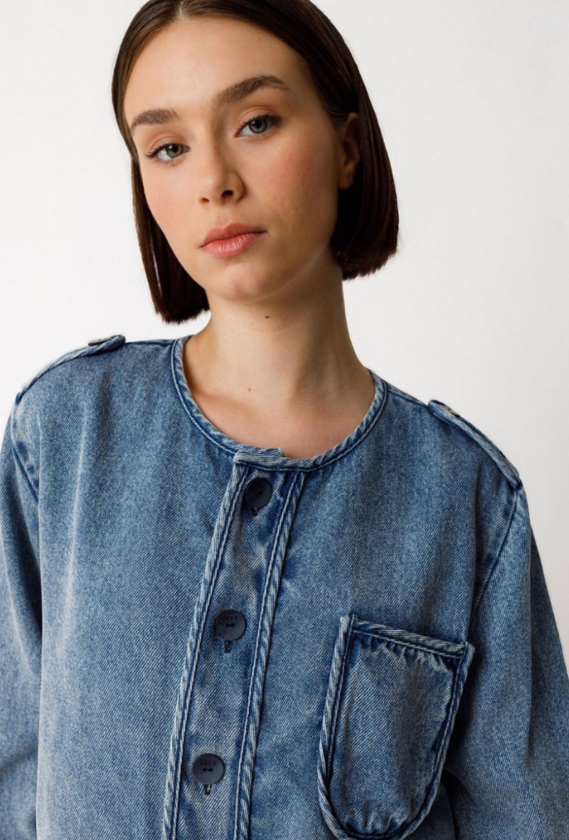 Es momento de hablar de las tres prendas que componen la nueva propuesta de moda con tejidos sostenibles de Skfk. La primera es una chaqueta que reinterpreta el tradicional kaiku, una prenda clásica de la vestimenta vasca. Esta versión actualizada mantiene las líneas esenciales del diseño original, adaptándose a los tiempos y a las tendencias contemporáneas. Detalles como los botones en las hombreras, el bolsillo frontal y las mangas estructuradas aportan un enfoque moderno sin perder la esencia cultural.