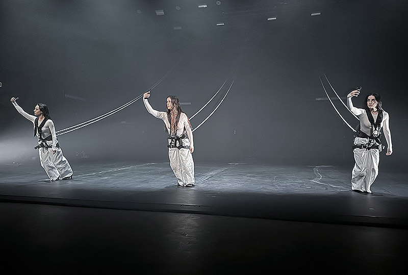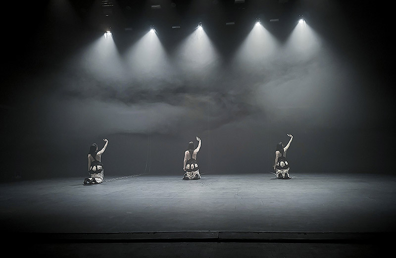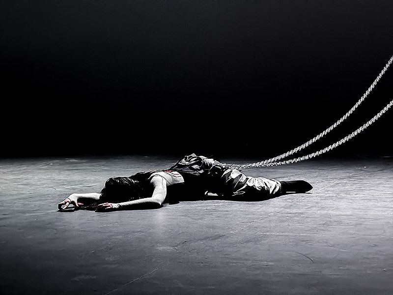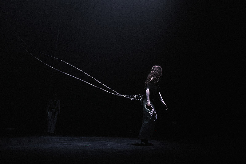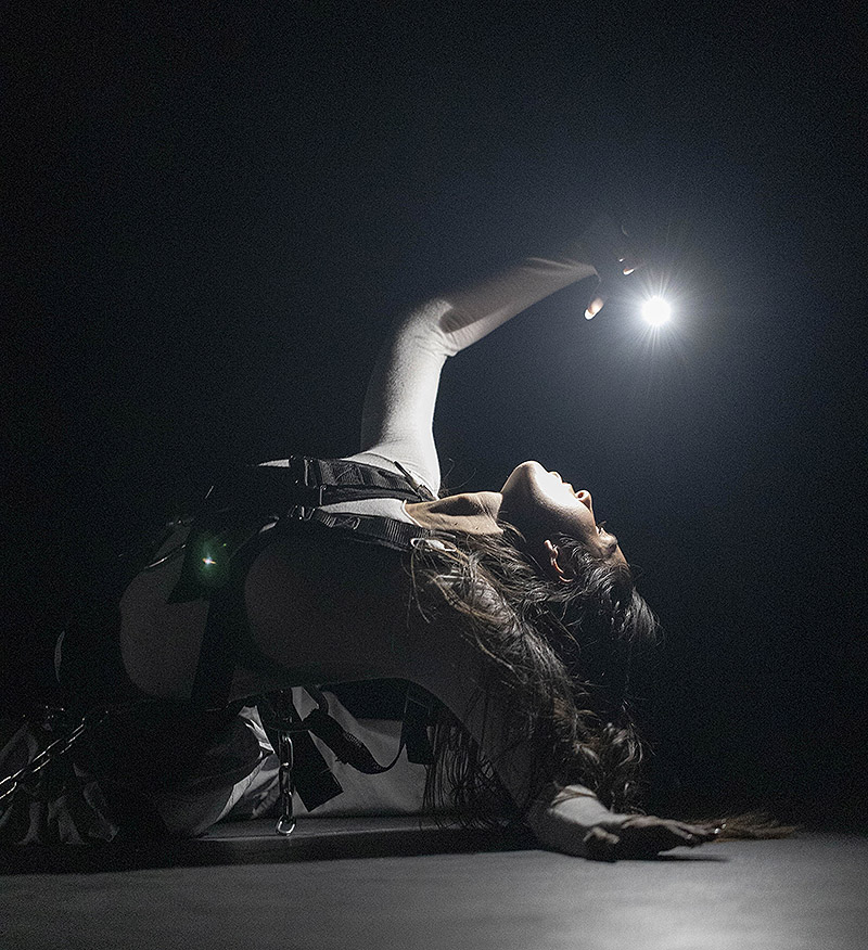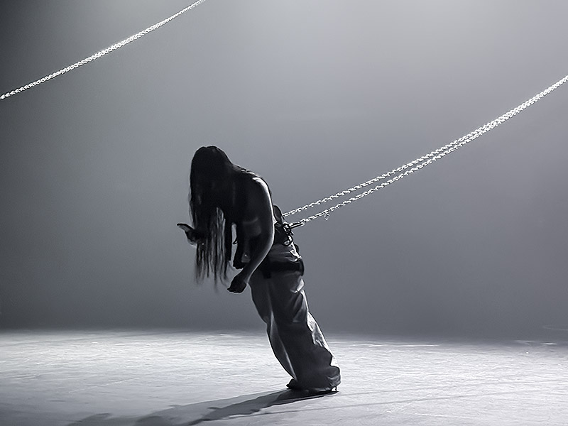 Arrodillas y de espaldas al público mientras se graban el rostro en el móvil y lo retransmiten en Instragram live. Así comienza el show en un escenario oscuro en el que solo intervienen cañones de luz blanca y una bruma tenebrosa artificial. Moviéndose hacia atrás en dirección al público, las bailarinas avanzan pacíficamente. Se arquean sin tocar el suelo valiéndose de las cadenas que las sujetan sin liberarlas jamás.