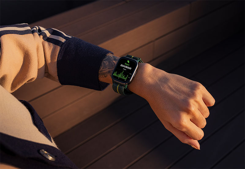 Ofrece también una correa de tela en color Pantone Trekking Green, aunque sus 22 mm de ancho permiten intercambiarla fácilmente por otros modelos de terceros