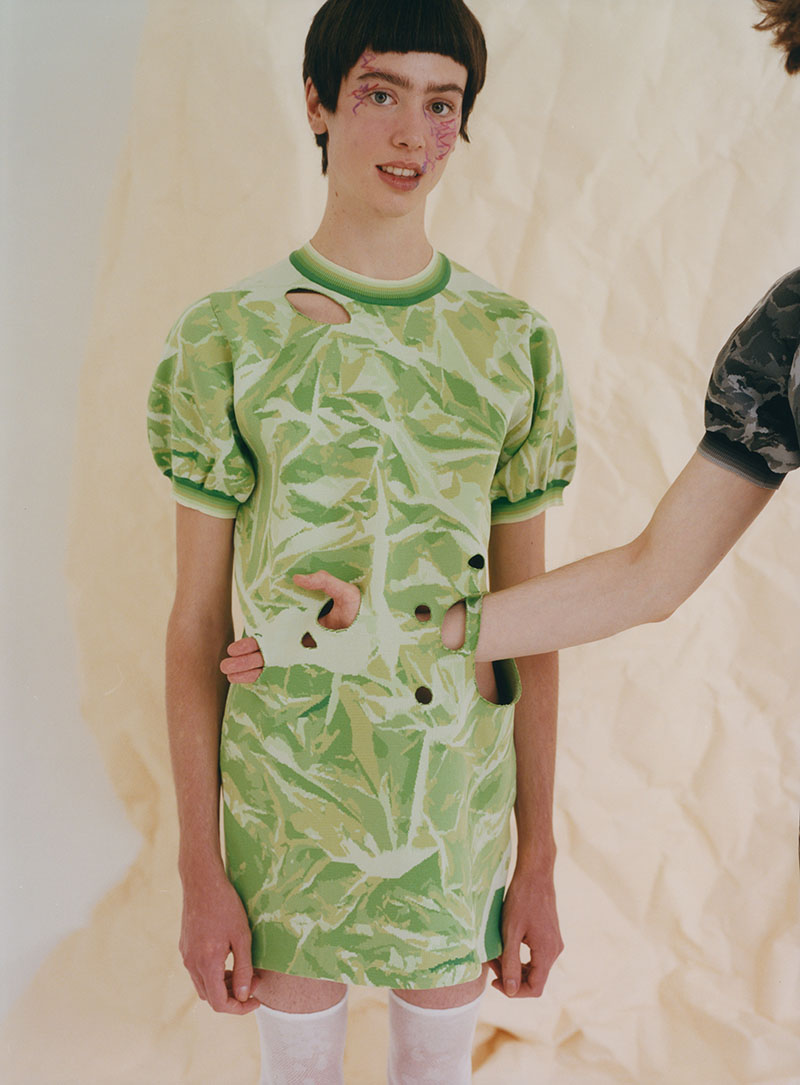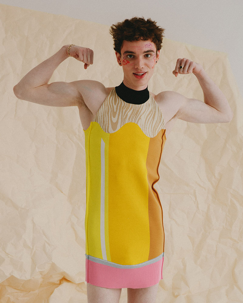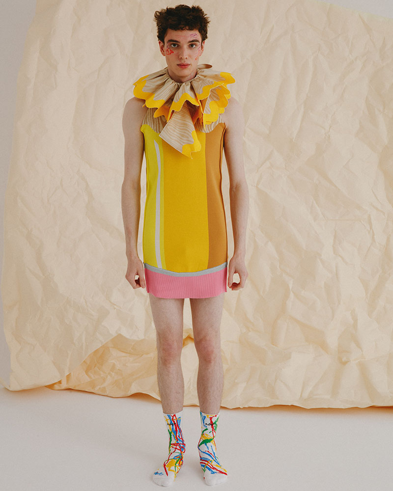 El tema de los sueños también está muy ligado a esta nueva colección de Motoguo SS23. Podemos identificarlo en las formas exageradas de las prendas, como el vestido sin mangas que toma forma de lápiz, o la falda que se convierte en un gran ojo abierto que observa.