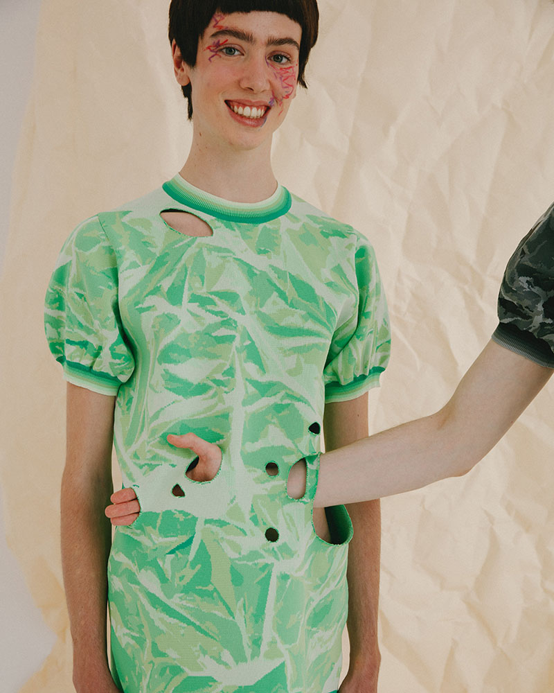 Esta inocencia se compensa un ciertos toques de perversidad, que vemos a través de detalles como los anteriormente mencionados ojos enormes que se estampan en algunas de las prendas.