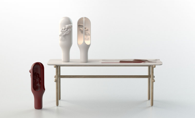 Arriba en la imagen: Mesa Pyréness y lámparas Cave diseñadas por Benjamin Graindorge