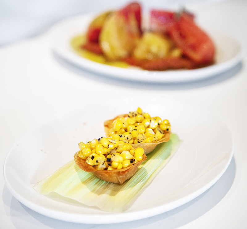 Juan Vargas, uno de los jefes de cocina de Muka, nos muestra, con entusiasmo, su última adquisición mañanera en el mercado de San Juan de Luz, en Francia. Un maíz miniatura que nos define como caviar vegetal. Comenta que unas dos o tres veces por semana, van al mercado y escogen personalmente el producto. En Muka la carta no es estática, cambia todos los días, adaptándola al productor y al producto de temporada. La inspiración la buscan a no más de 30 km a la redonda.
