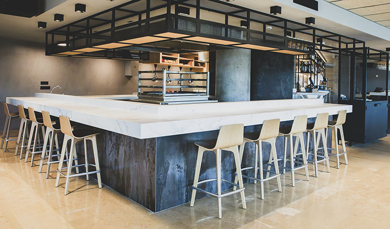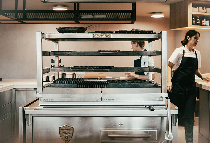 La parrilla Josper, situada en el centro de la cocina, y a vista del cliente, es la protagonista de la escena. Una cocina vista, delimitada por una barra de mármol blanco y taburetes. Todo un acierto, ya que nos hace una experiencia mucho más íntima en la que interactuamos de una forma más directa con la cocina, y desde donde podrás vislumbrar la habilidad portentosa de Celeste, maestra parrillera de Muka.
