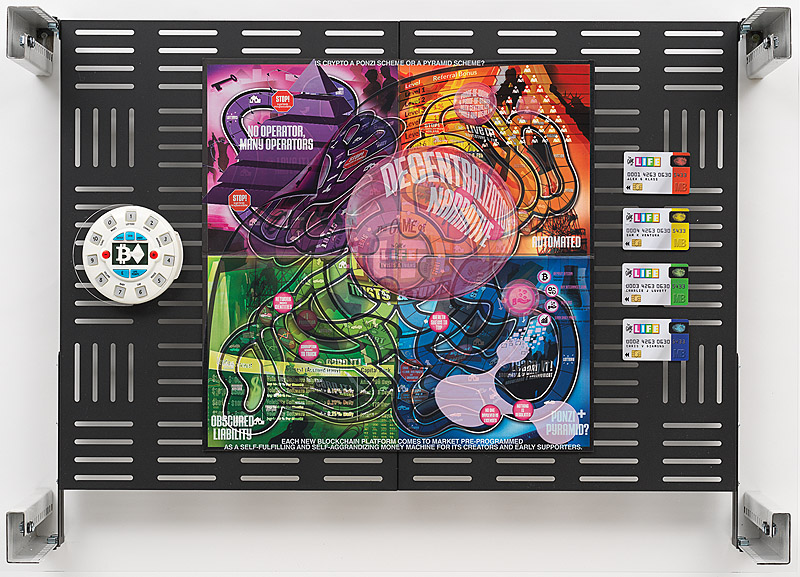 Las redes sociales están en el centro de los problemas actuales, y la tecnología blockchain y los intercambios de datos han generado un mundo multiusuario que plantea la cuestión de la autoría y el carácter único de una obra. Las sátiras sociales y políticas, como las de los artistas Simon Denny y Neïl Beloufa, son también la crítica a una red vertical totalizadora con una dimensión adictiva y depresiva, muy alejada de la utopía emancipadora de la red en los inicios de la era digital.