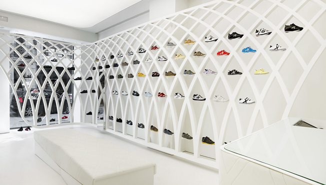 Munich nace en 1939 como marca de calzado deportivo, indoor, principalmente. Después de más 70 años, sus diseños además de superar la barrera del mercado deportivo, han llegado a todo el mundo, consiguiendo que el símbolo de la marca, la X, sea reconocido en más de 40 países. Ahora, la firma abre una segunda tienda en Valencia, en la calle Jorge Juan. Un espacio limpio y minimal de 60 metros, diseñado por Dear Design, donde prima la luz y los expositores con toda las líneas de Munich, desde las más sofisticadas a los modelos de bebé. La economía de materiales protagoniza el diseño de la nueva tienda: chapa de hierro lacada en blanco satinado para el perímetro, Corian en la rotulación, barrisol en la iluminación, hierro natural en la carpintería, resina de poliuretano blanco con barniz satinado en pavimento y piel blanca y chapa de hierro en mobiliario.