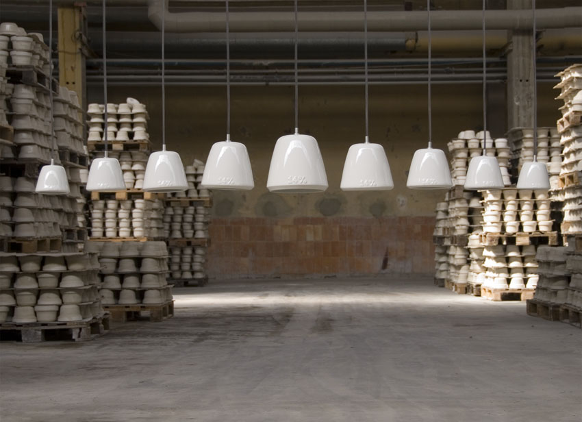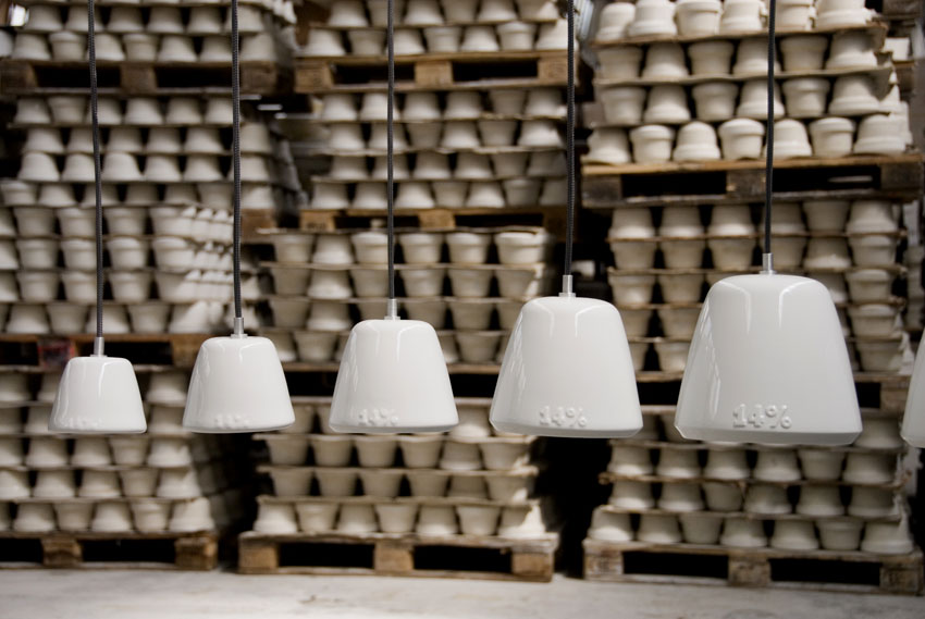 Las tres imágenes de arriba: 14% Lámparas de porcelana. Este proyecto está inspirado en una anécdota, una empresa alemana copió figuras de porcelana chinas tradicionales. La reproducción del molde era exactamente igual que el original y la figura exactamente igual, sólo tenian una diferencia, habían encogido un 14%. La autora ha hecho esta serie de lámparas copiando su propio original. Se puede apreciar como cada copia es más pequeña y como el número va perdiendo definición. Diseño de Laura Straßer.