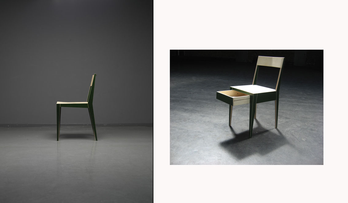 Arriba a la izquierda, Silla Stuhl #2 a la derecha Silla Stuhl #1 igual que la primera pero con cajón, Las dos diseñadas por 45 kilo