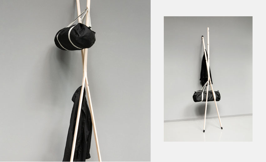 Arriba: Crotch, Una pieza simple de mobiliario que sirve para un contexto complejo. Un perchero que se apoya contra la pared y que sirve para colgar todo tipo de cosas. Diseño de Sebastian Schönheit